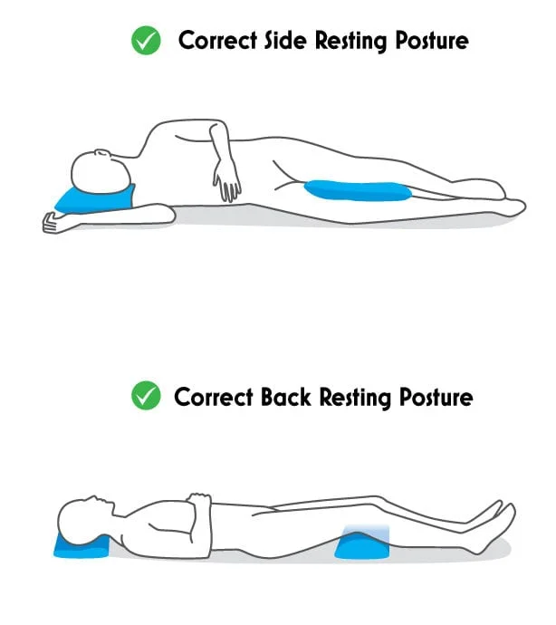 Rest on a firm bed or sofa in a comfortable position and keep pillows under your head. If you prefer lying on your back keep another pillow under your knees, or if you lie on your side keep it between your knees. The extra pillows help keep the spine properly aligned and reduce the stress on discs, ligaments, and muscles.